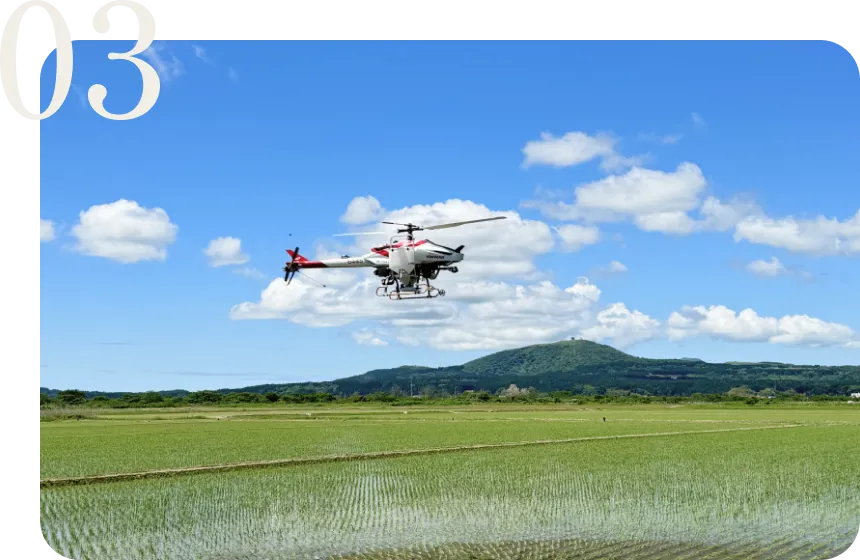 - お米の病気を防ぐため、ラジコンヘリコプター・ドローンによる害虫駆除農薬散布業務を行っております。