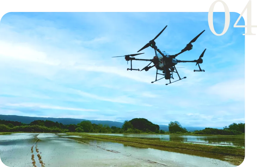 - ドローンや最先端の技術を活用し、稲作を行っております。