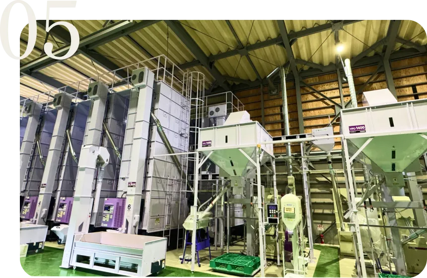 - にかほ市金浦に自社乾燥調整施設を開設し、農家さんから受け入れて乾燥、もみすり、精選し玄米にし包装するまでの一環作業を行っております。